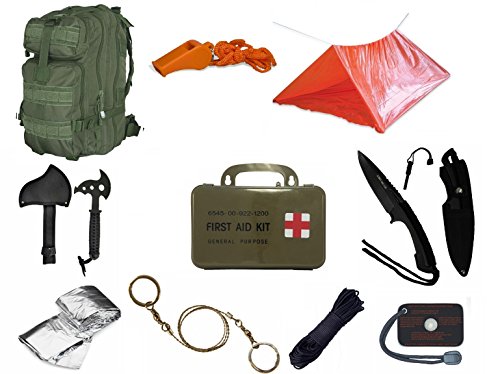 Ultimate Arms Gear Level 3 Assault MOLLE OD Green Backpack Kit; Signal Mirror, Polarshield Blanket, Knife Fire Starter, Wire Saw, Axe, 50' Foot Paracord, Camping Tube Tent, Whistle & First Aid Kit